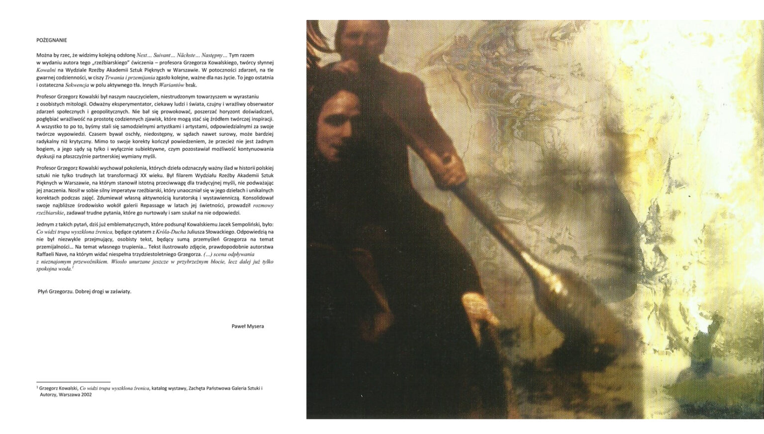 Jednym z takich pytań, dziś już emblematycznych, które podsunął Kowalskiemu Jacek Sempoliński, było: Co widzi trupa wyszklona źrenica, będące cytatem z Króla-Ducha Juliusza Słowackiego. Odpowiedzią na nie był niezwykle przejmujący, osobisty tekst, będący sumą przemyśleń Grzegorza na temat przemijalności… Na temat własnego trupienia… Tekst ilustrowało zdjęcie, prawdopodobnie autorstwa Raffaeli Nave, na którym widać niespełna trzydziestoletniego Grzegorza. (…) scena odpływania z nieznajomym przewoźnikiem. Wiosło unurzane jeszcze w przybrzeżnym błocie, lecz dalej już tylko spokojna woda. 1